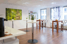 Kostenlose Parkplätze finden Sie direkt am Haus oder gegen eine Gebühr von 5 Euro in einer Tiefgarage. Erdgeschoss, Getränkebar, überdachter Außenbereich für Raucher.